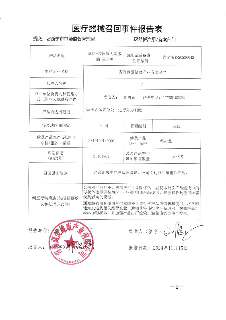青海藏愛健康產(chǎn)業(yè)有限公司對葵花-穴位 壓力刺激貼 暈車型 主動召回瀏覽數(shù):167